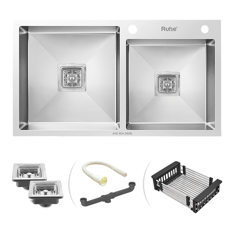 Handmade Double Bowl Kitchen Sinks are manufactured in 1.2mm thick Premium Stainless Steel and equipped with Sound-deadening Foam Pads and come with all installation accessories - waste pipe, |