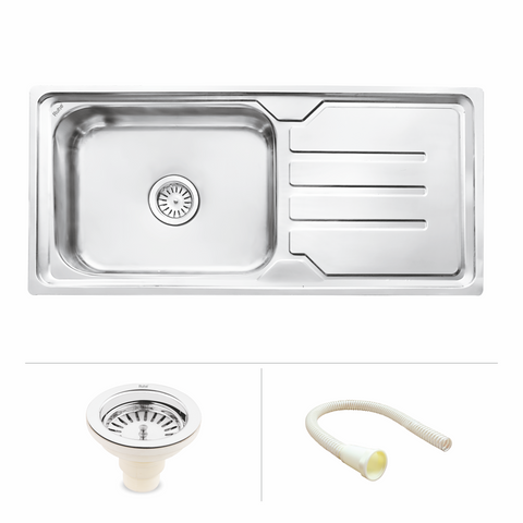Square Single Bowl Drainboard Kitchen Sinks built with 1mm thick Premium Stainless Steel and come with Sound-deadening Pads, Installation Accessories (Waste pipe & coupling), and 10 Years |
